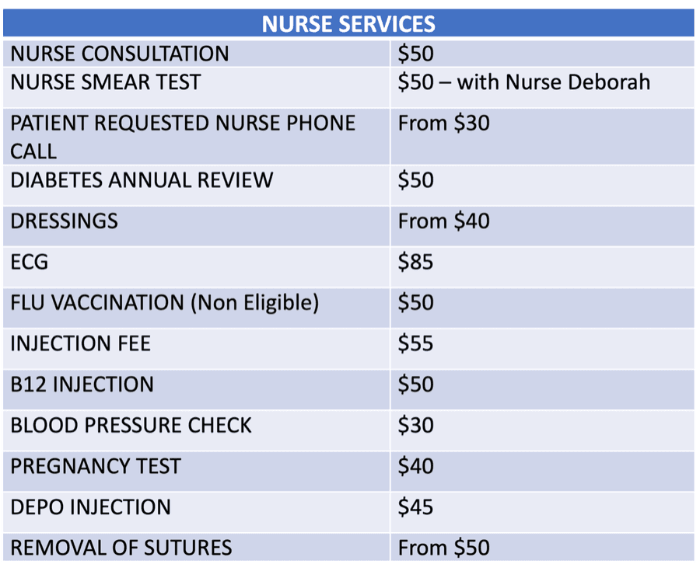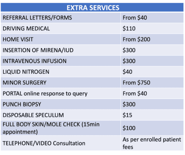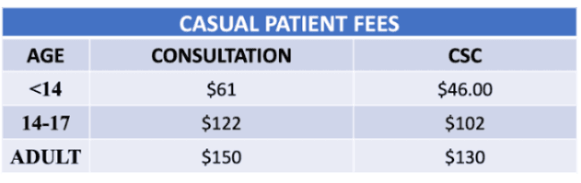 - Notes about Fees:- First adult appointmnets are given extra time and charged at the casual patient fee.
